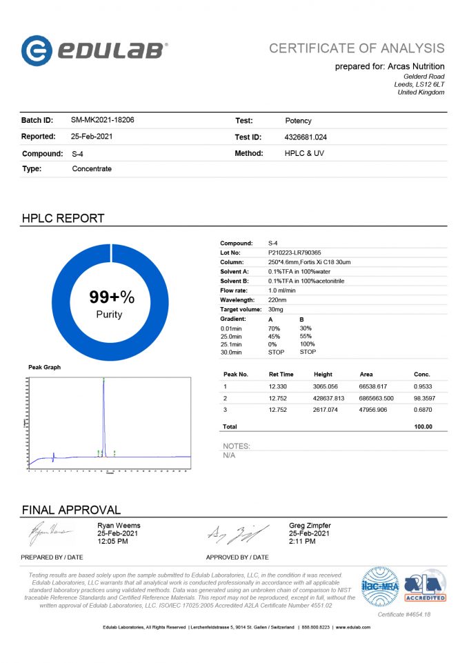 La Andarina S-4 es definitivamente el SARM más adaptable que existe. Es el primer SARM que ha sido aprobado para un ensayo clínico de fase 2. Cuando se demostró su potencial anabólico, se decidió utilizarlo para tratar problemas musculares relacionados a la edad, la osteoporosis y a los diversos efectos secundarios del hipogonadismo.